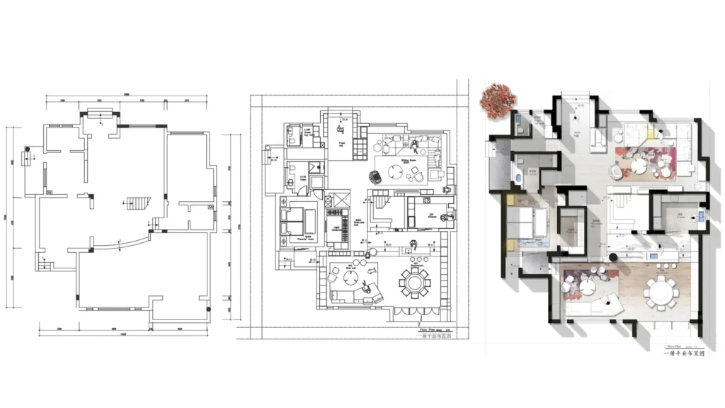 Rough visual ideas that help you imagine the overall structure, space planning, and initial design direction. quick, raw, and full of potential.