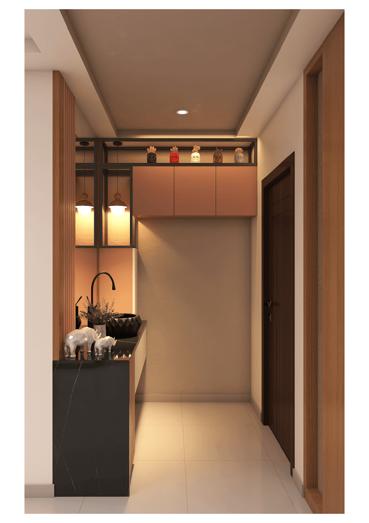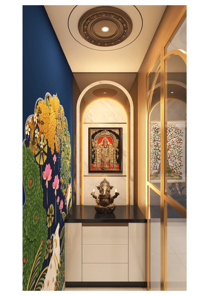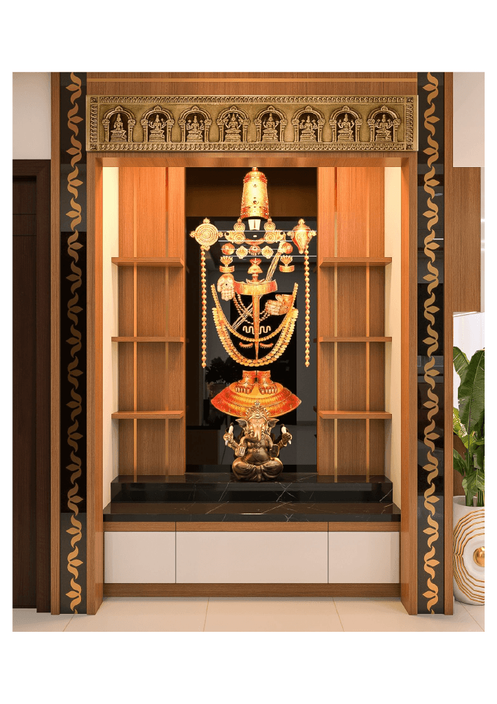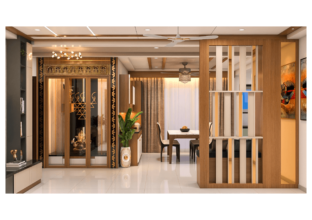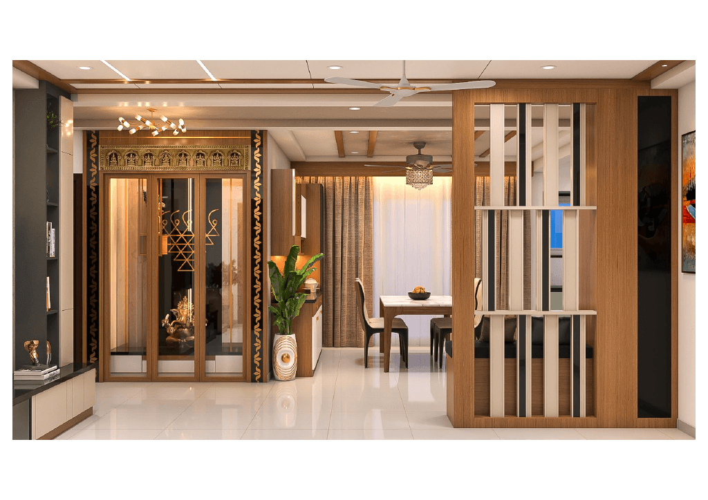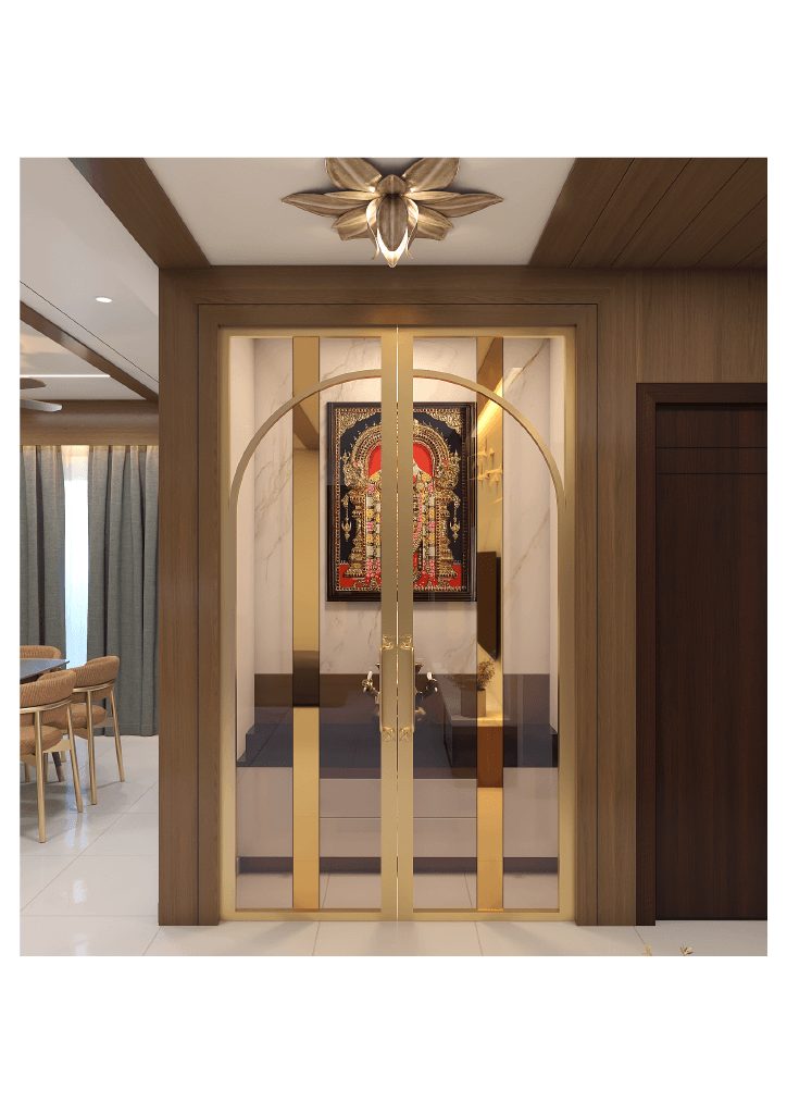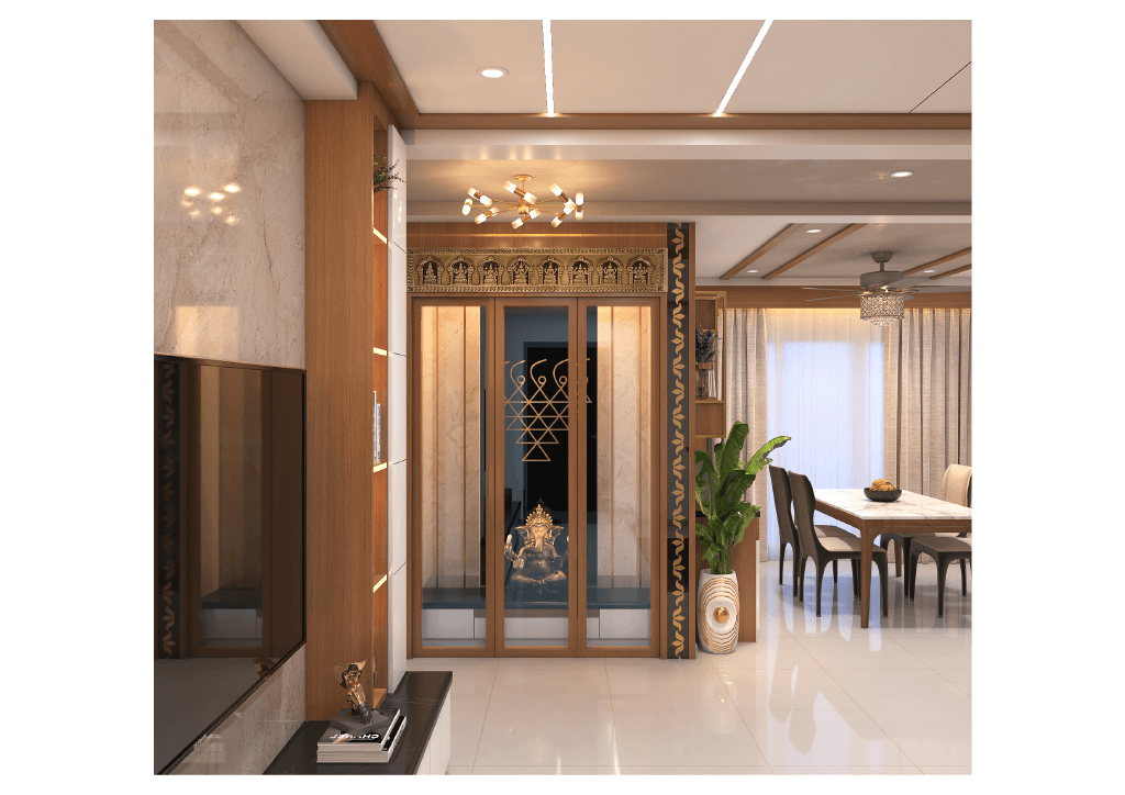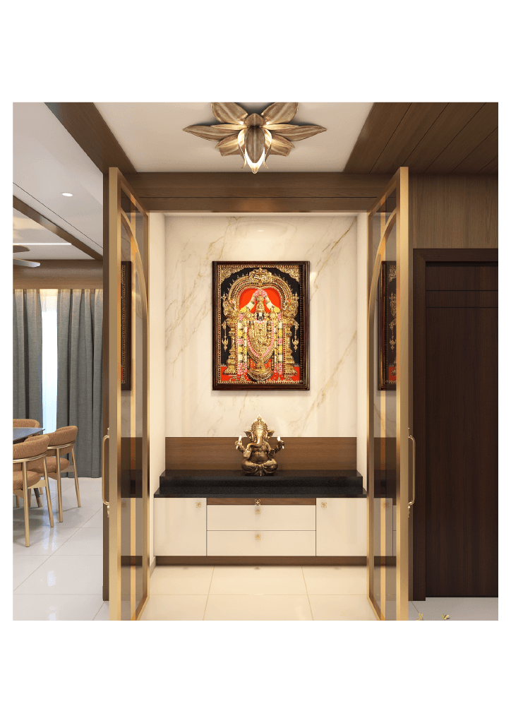 The design begins with a beautifully crafted pooja room, featuring rich wooden tones, intricate golden detailing, and soft illumination that creates a serene spiritual corner. The glass shutters and ornamental borders add a touch of traditional luxury, making it one of the strongest statements in the home.