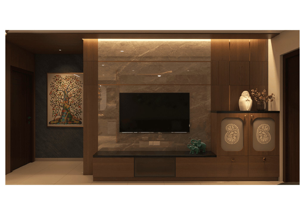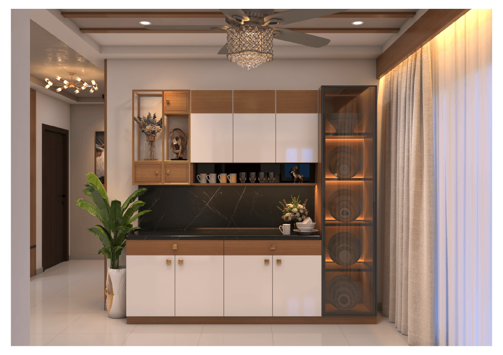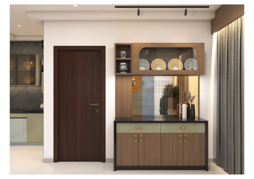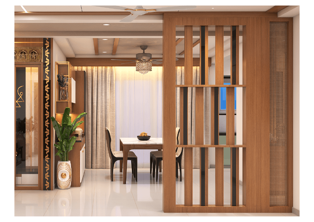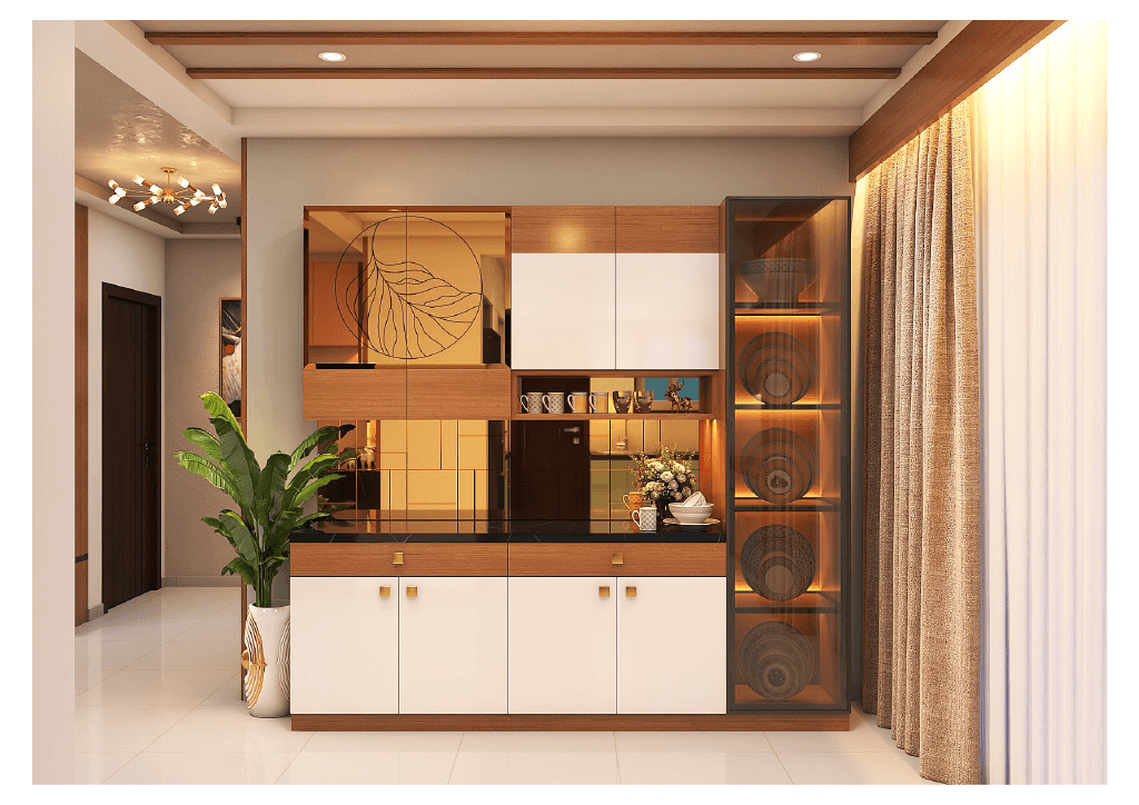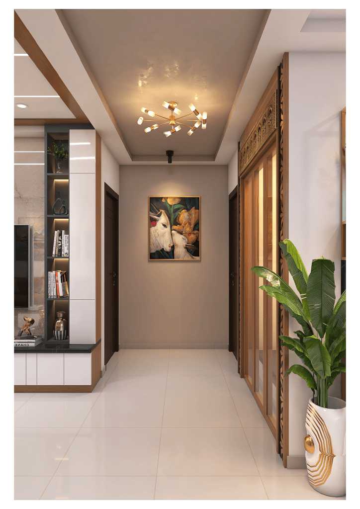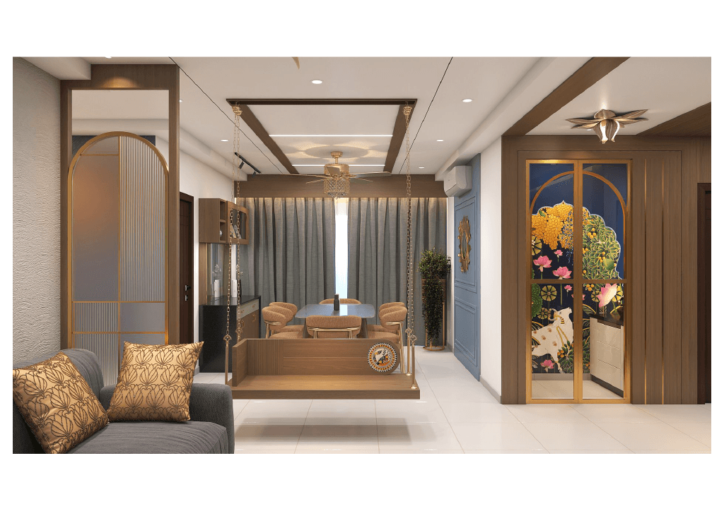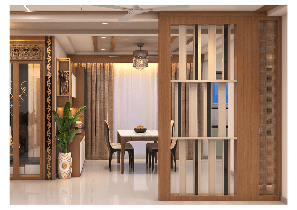 The design begins with a beautifully crafted pooja room, featuring rich wooden tones, intricate golden detailing, and soft illumination that creates a serene spiritual corner. The glass shutters and ornamental borders add a touch of traditional luxury, making it one of the strongest statements in the home.