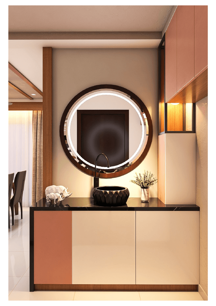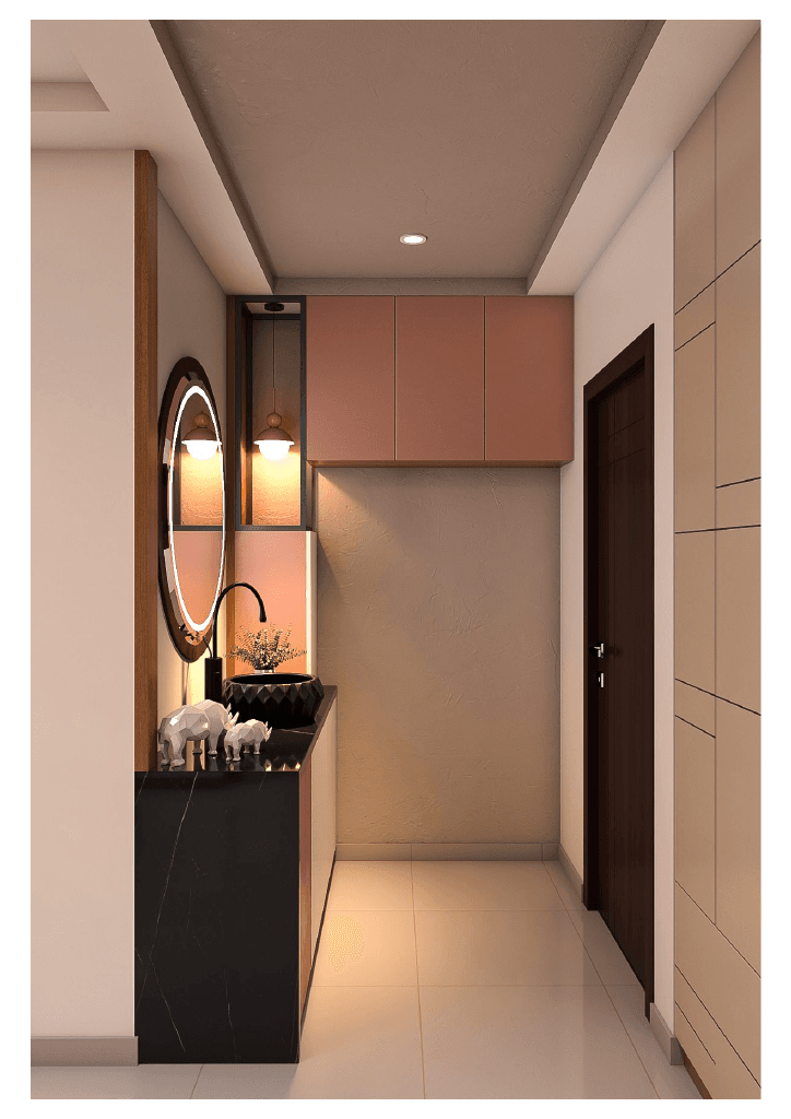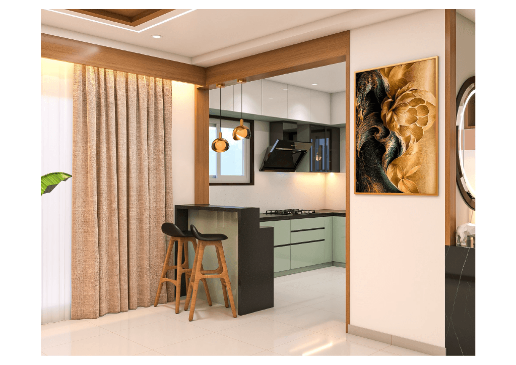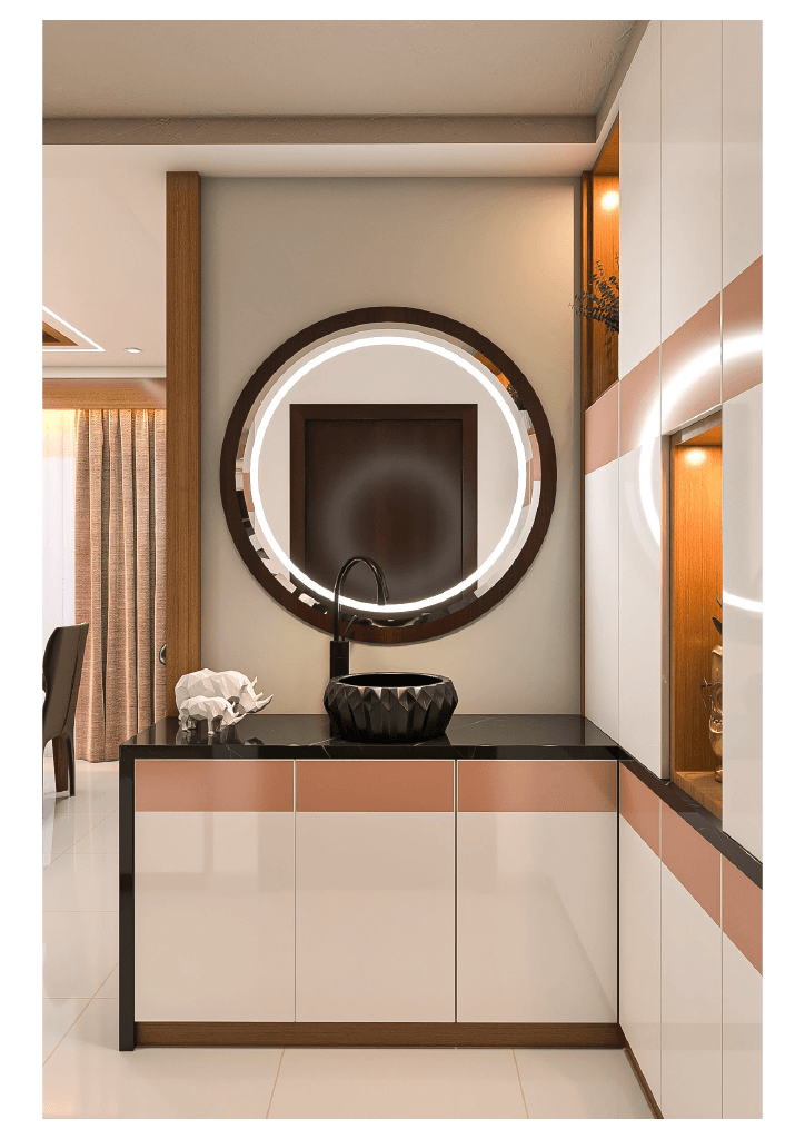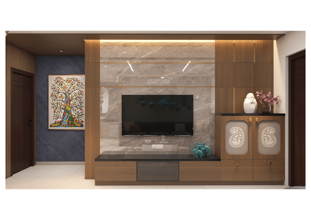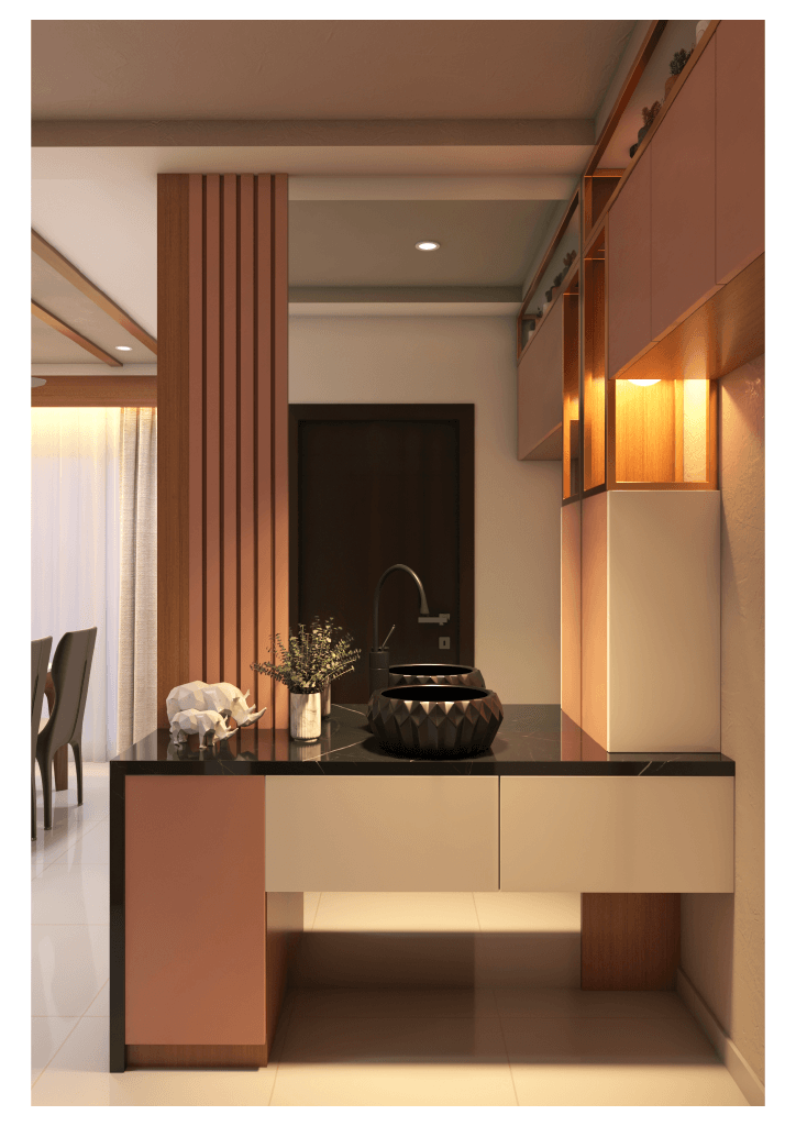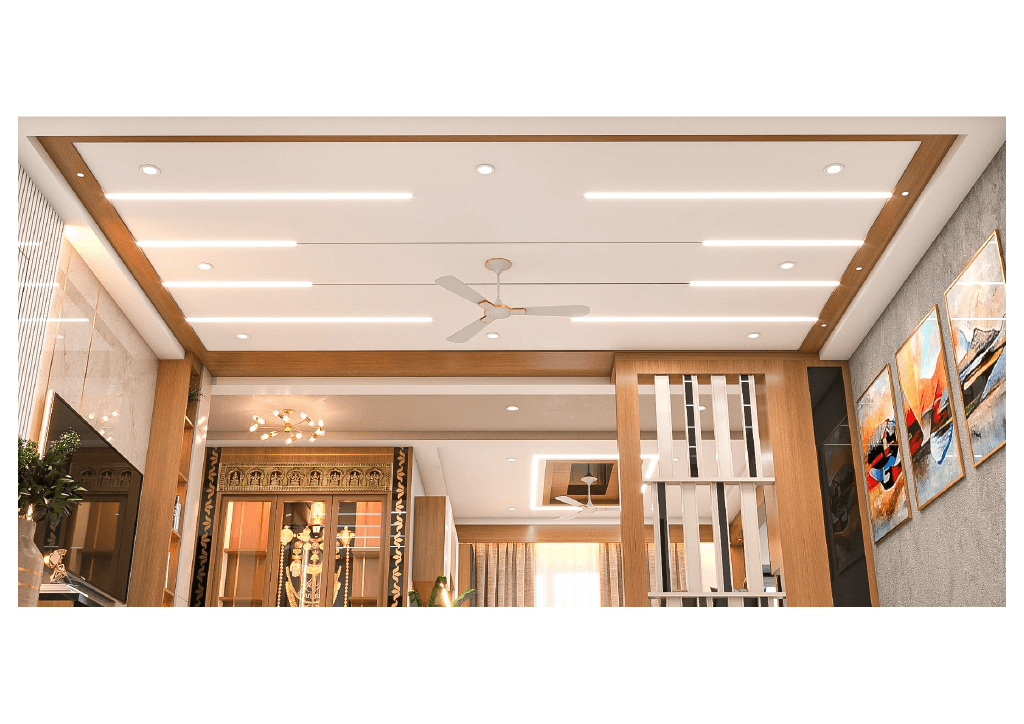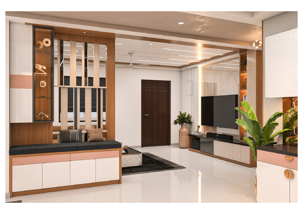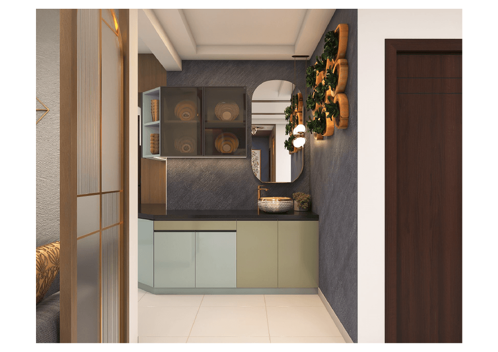 The design begins with a beautifully crafted pooja room, featuring rich wooden tones, intricate golden detailing, and soft illumination that creates a serene spiritual corner. The glass shutters and ornamental borders add a touch of traditional luxury, making it one of the strongest statements in the home.