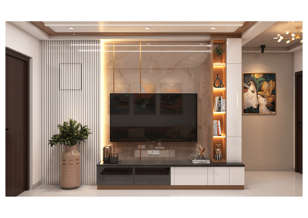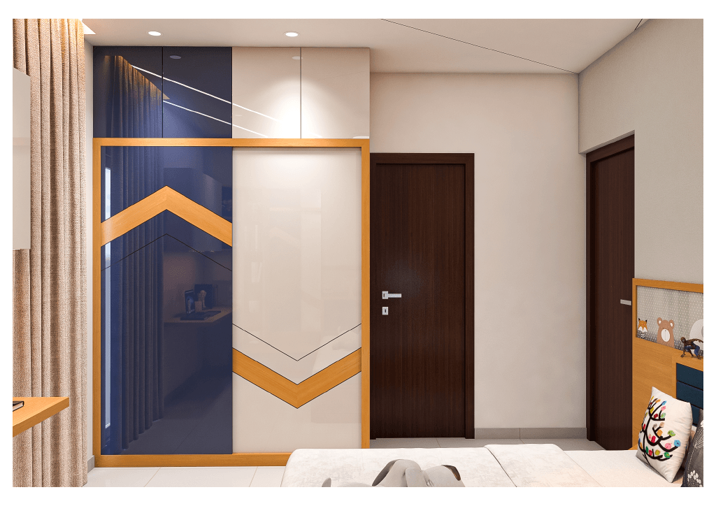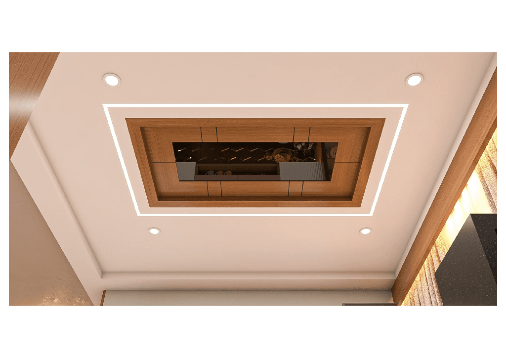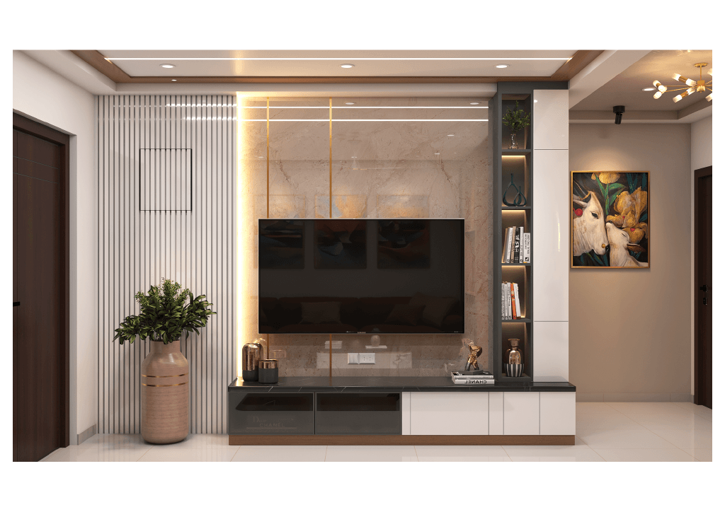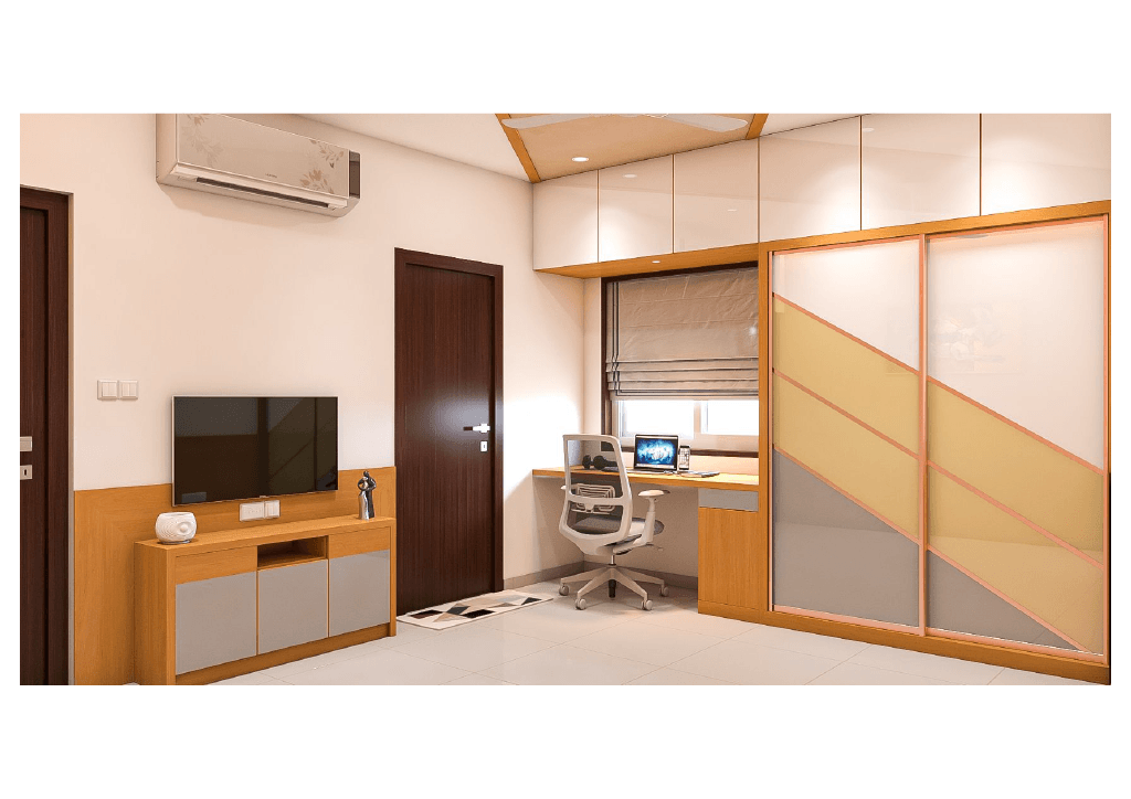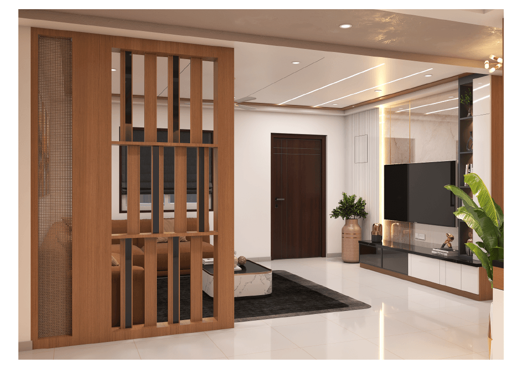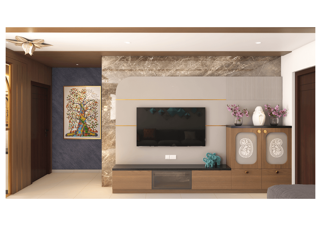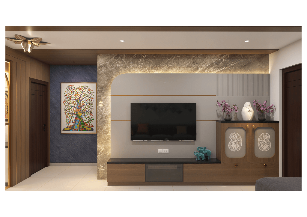 The design begins with a beautifully crafted pooja room, featuring rich wooden tones, intricate golden detailing, and soft illumination that creates a serene spiritual corner. The glass shutters and ornamental borders add a touch of traditional luxury, making it one of the strongest statements in the home.