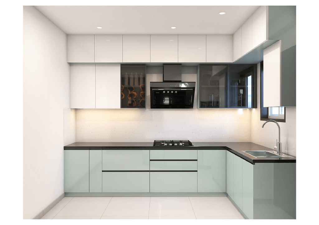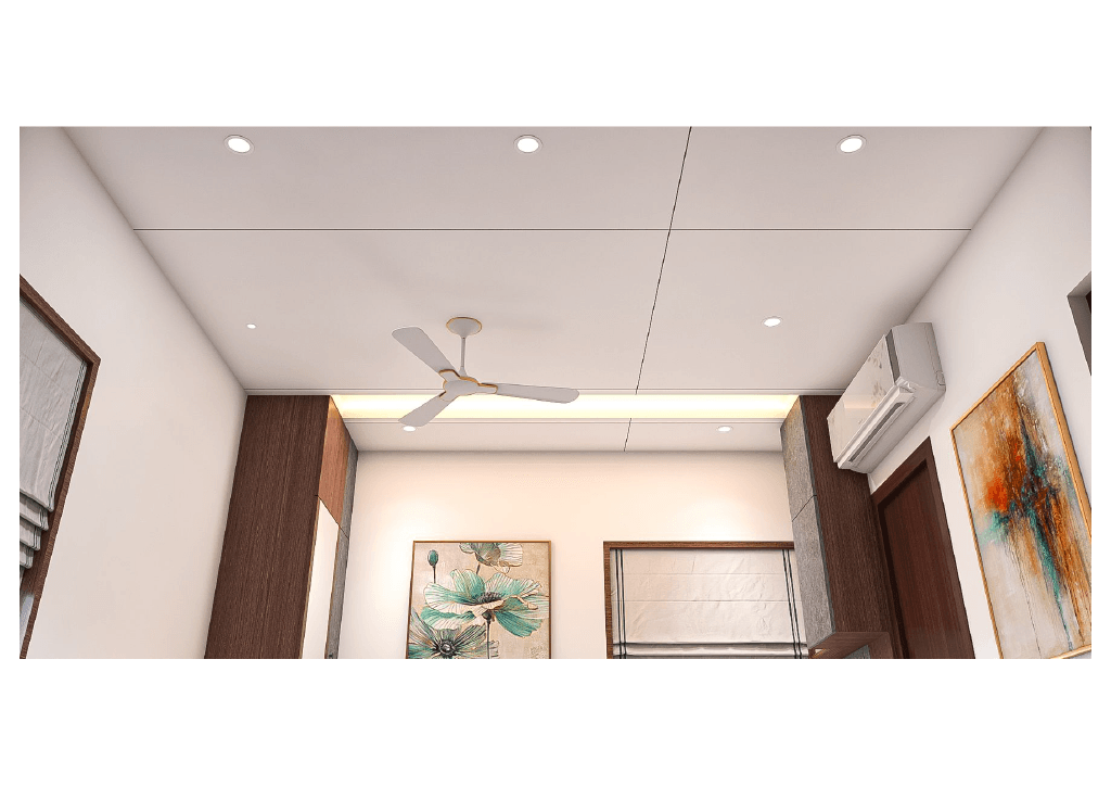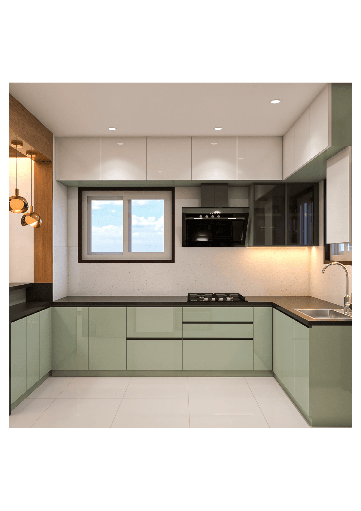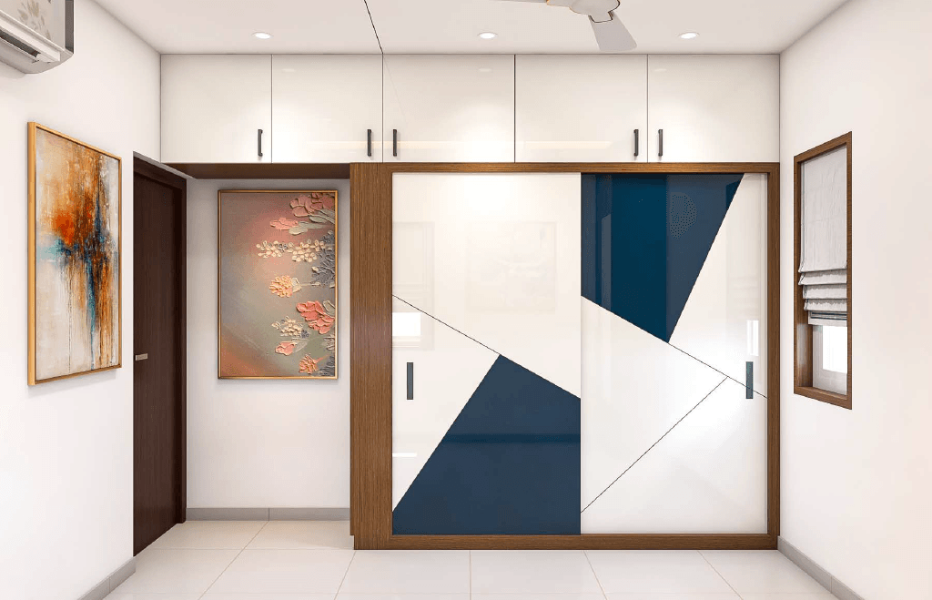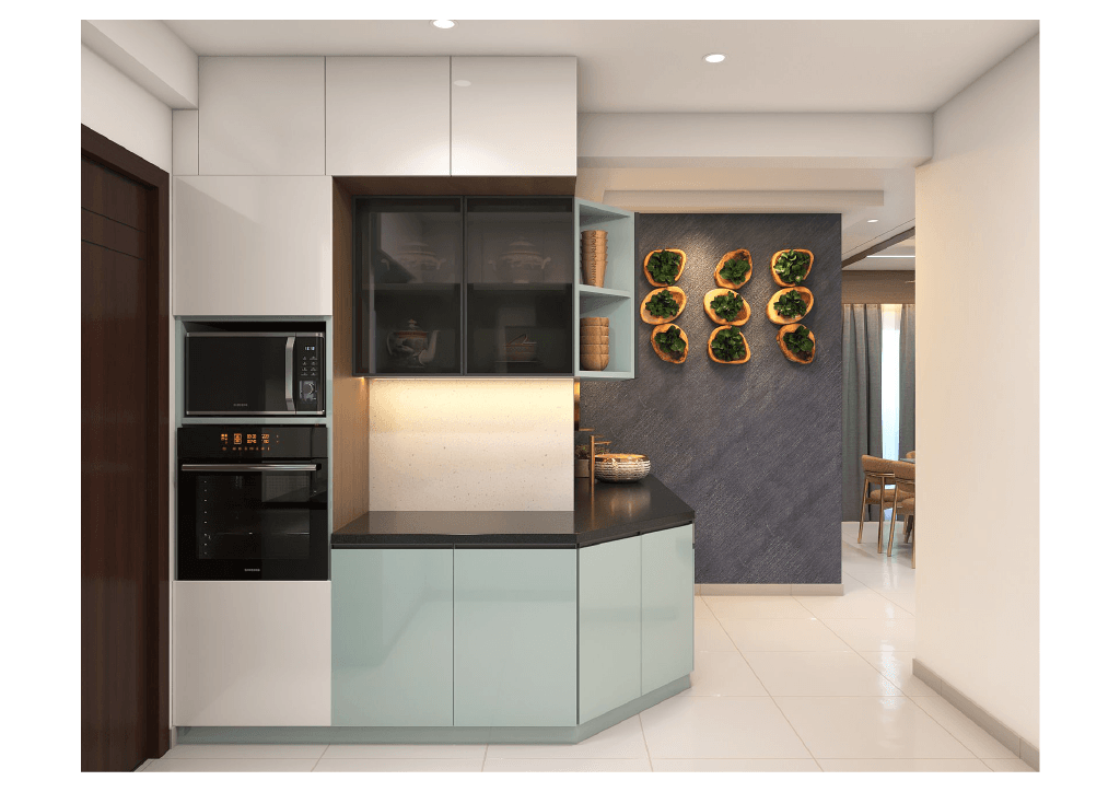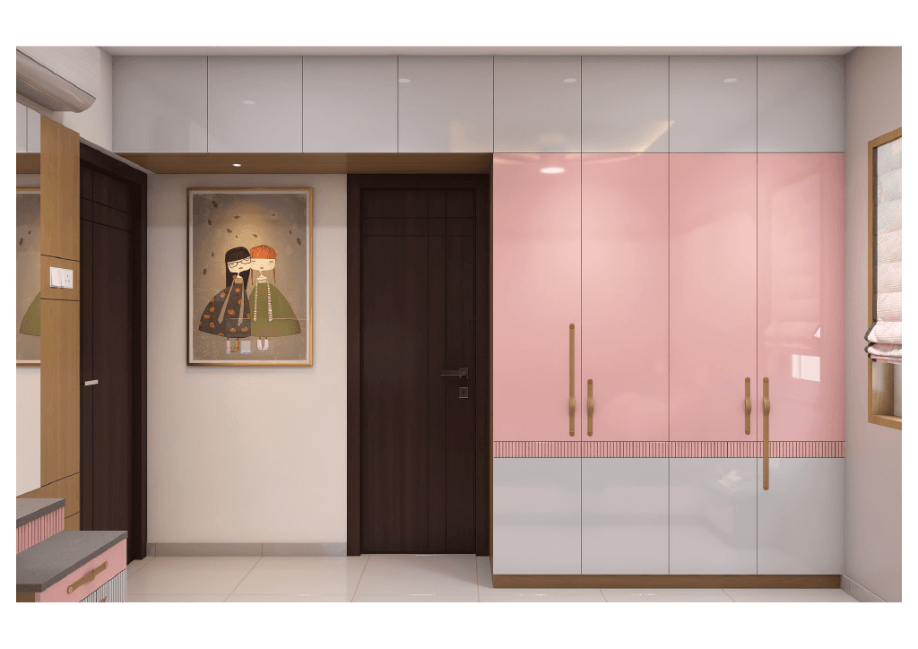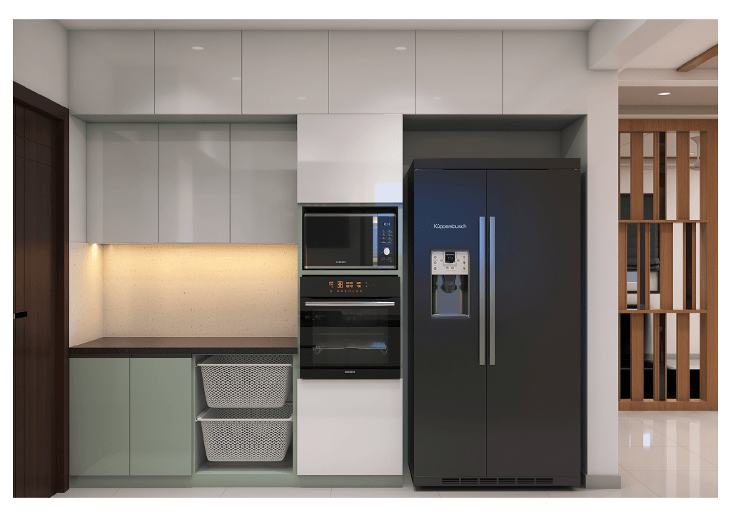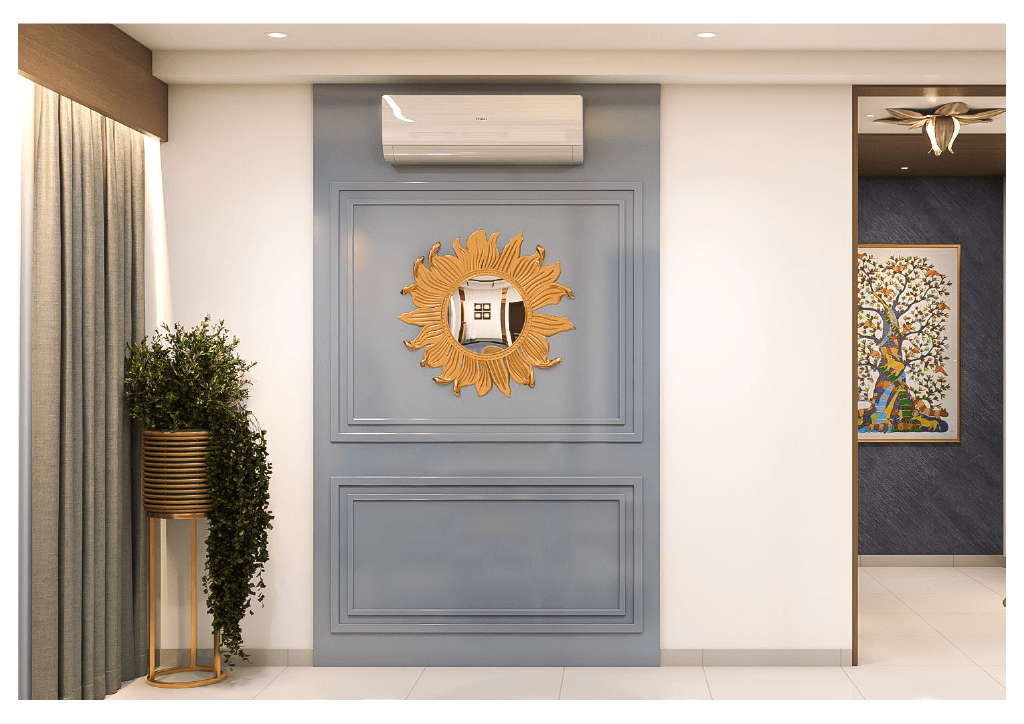 The design begins with a beautifully crafted pooja room, featuring rich wooden tones, intricate golden detailing, and soft illumination that creates a serene spiritual corner. The glass shutters and ornamental borders add a touch of traditional luxury, making it one of the strongest statements in the home.