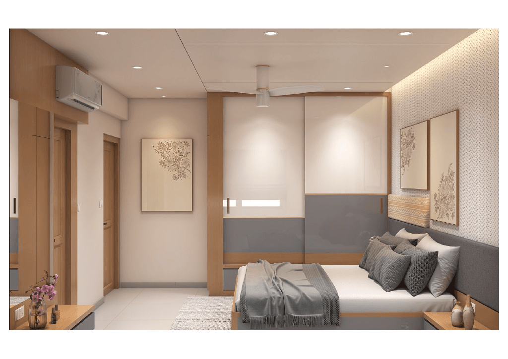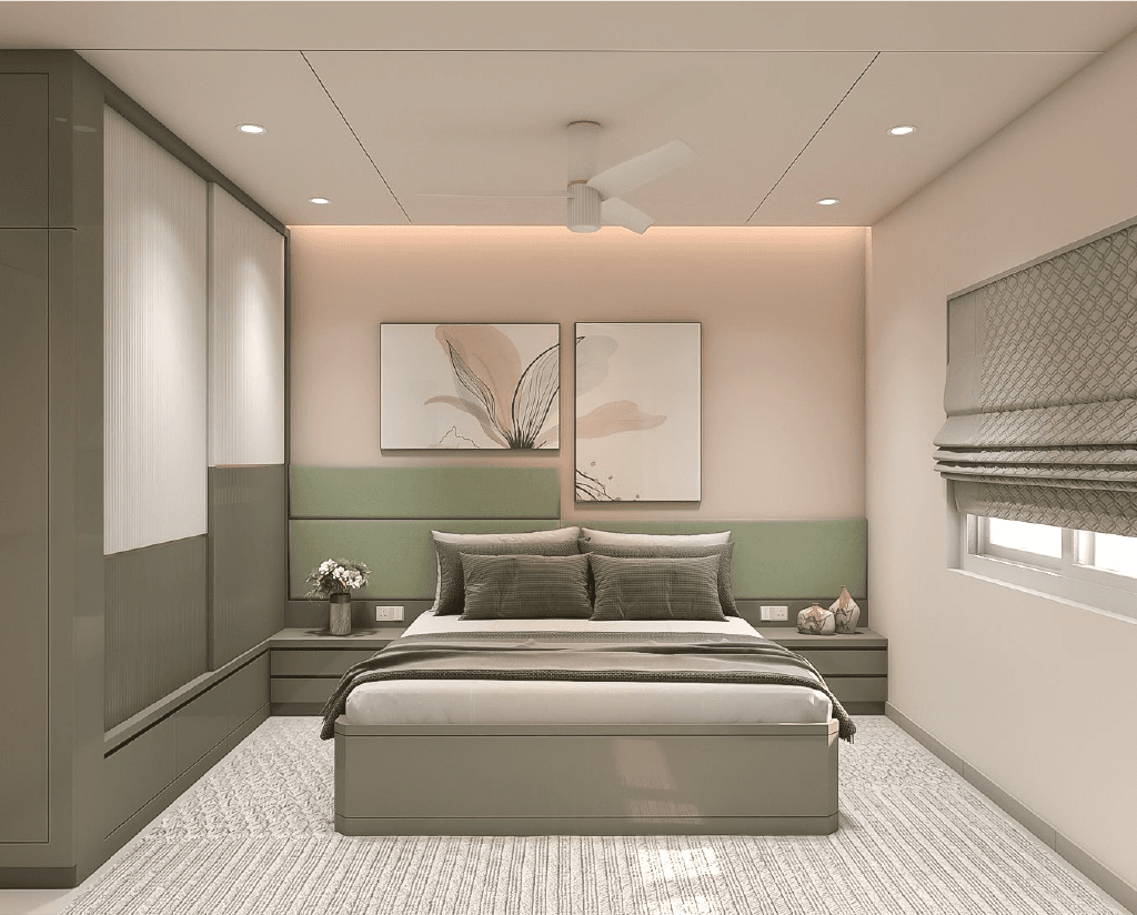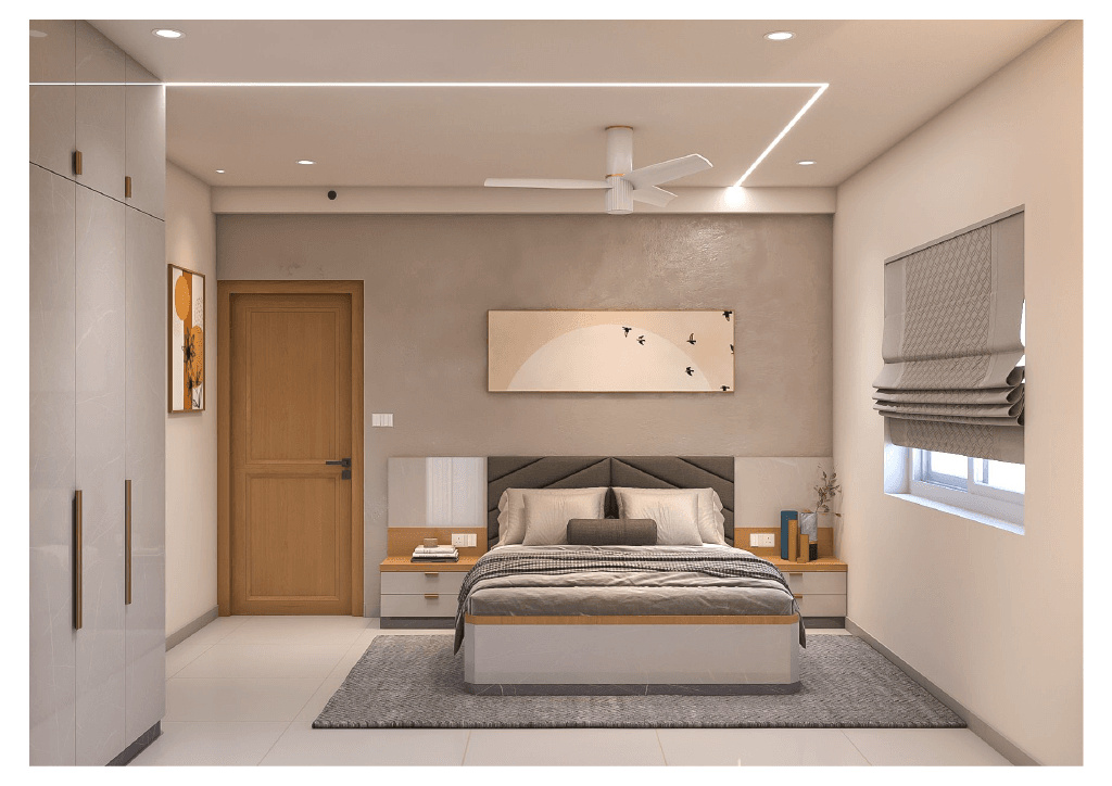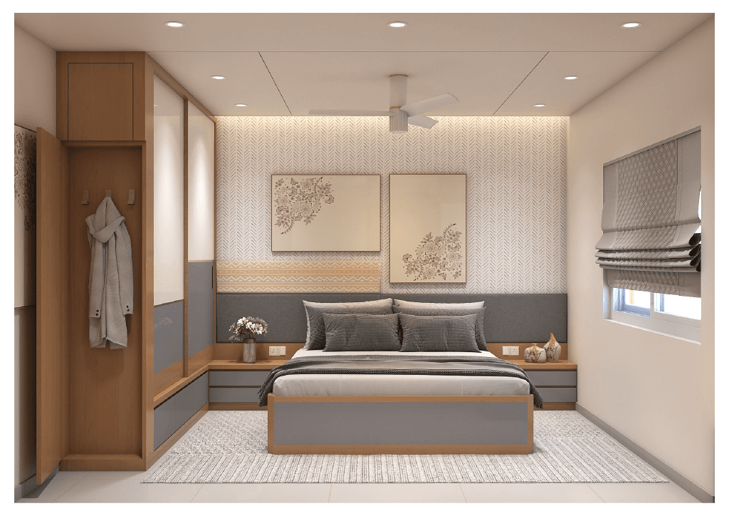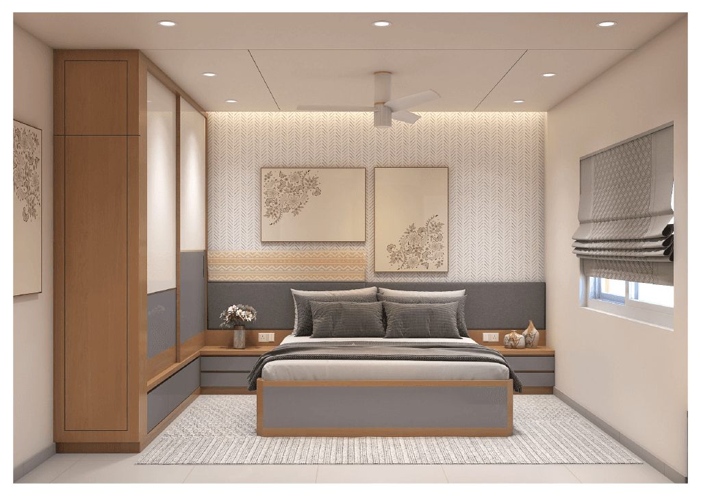 The master bedroom features a serene combination of soft greys, warm beige accents, and layered lighting that brings out the beauty of the patterned wallpaper backdrop. The custom bed frame, floating side tables, and integrated wardrobe blend seamlessly into the space, giving the room a clean and uncluttered look.