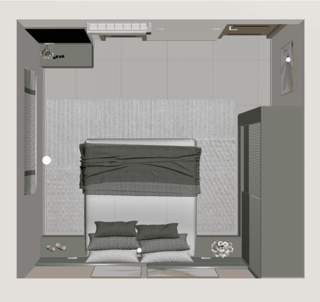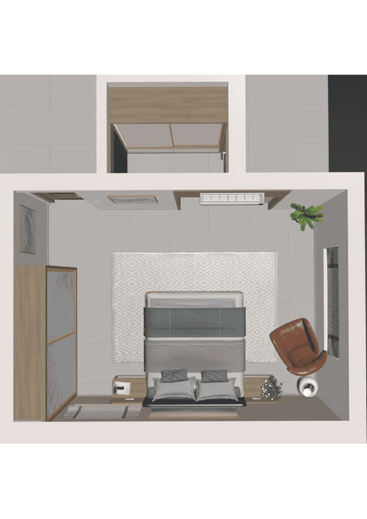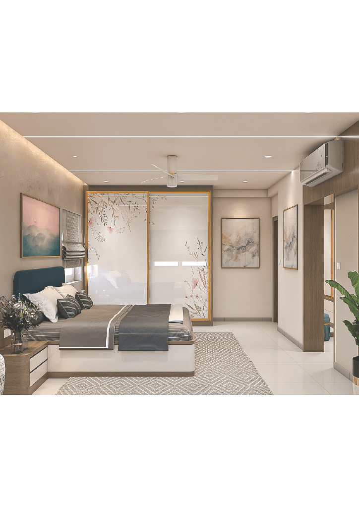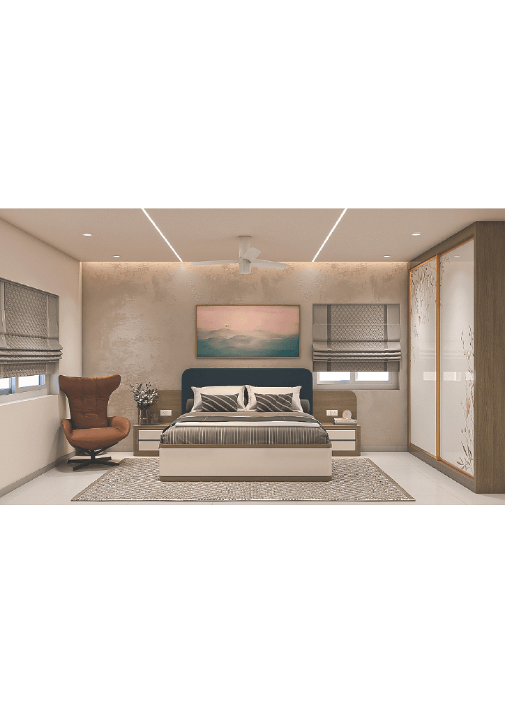 The master bedroom features a serene combination of soft greys, warm beige accents, and layered lighting that brings out the beauty of the patterned wallpaper backdrop. The custom bed frame, floating side tables, and integrated wardrobe blend seamlessly into the space, giving the room a clean and uncluttered look.