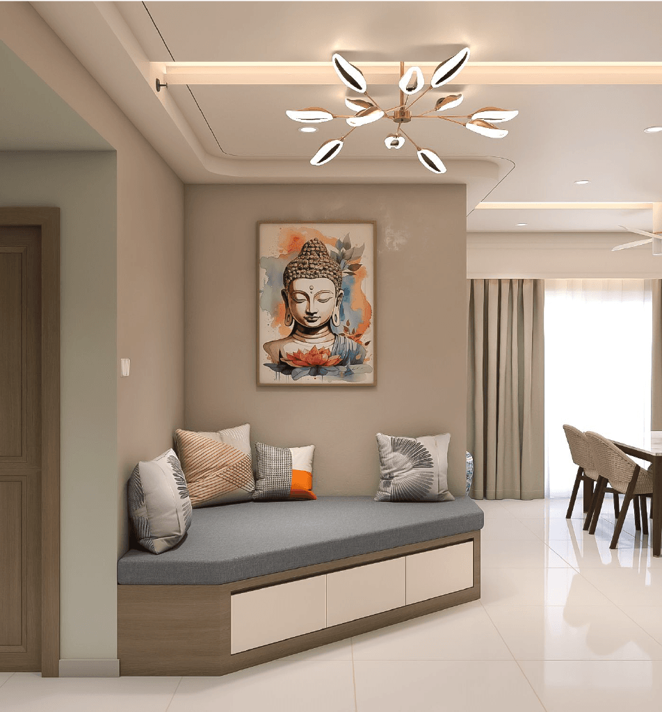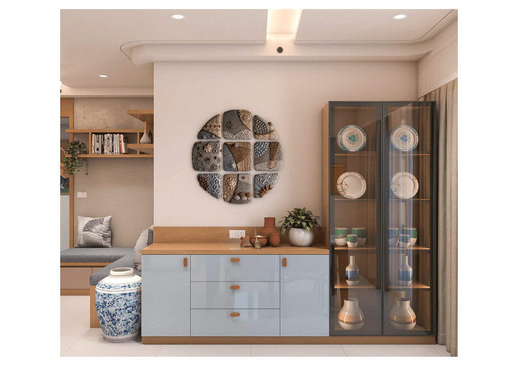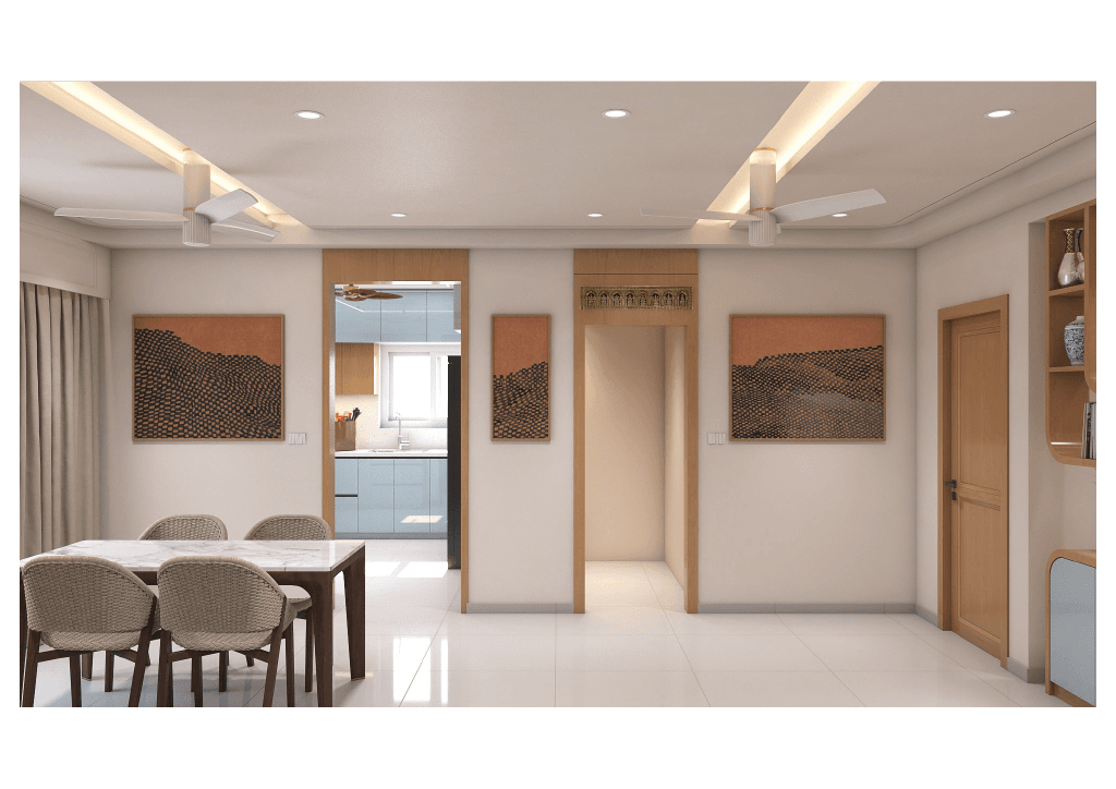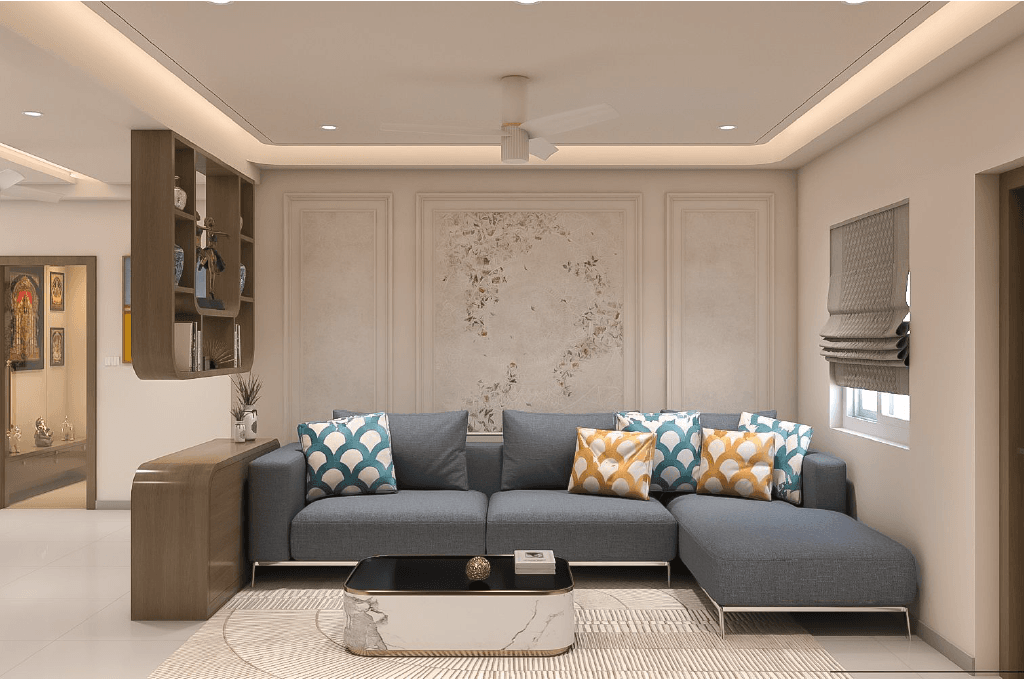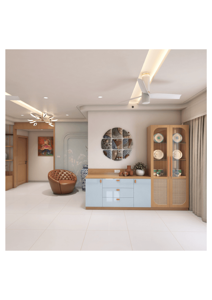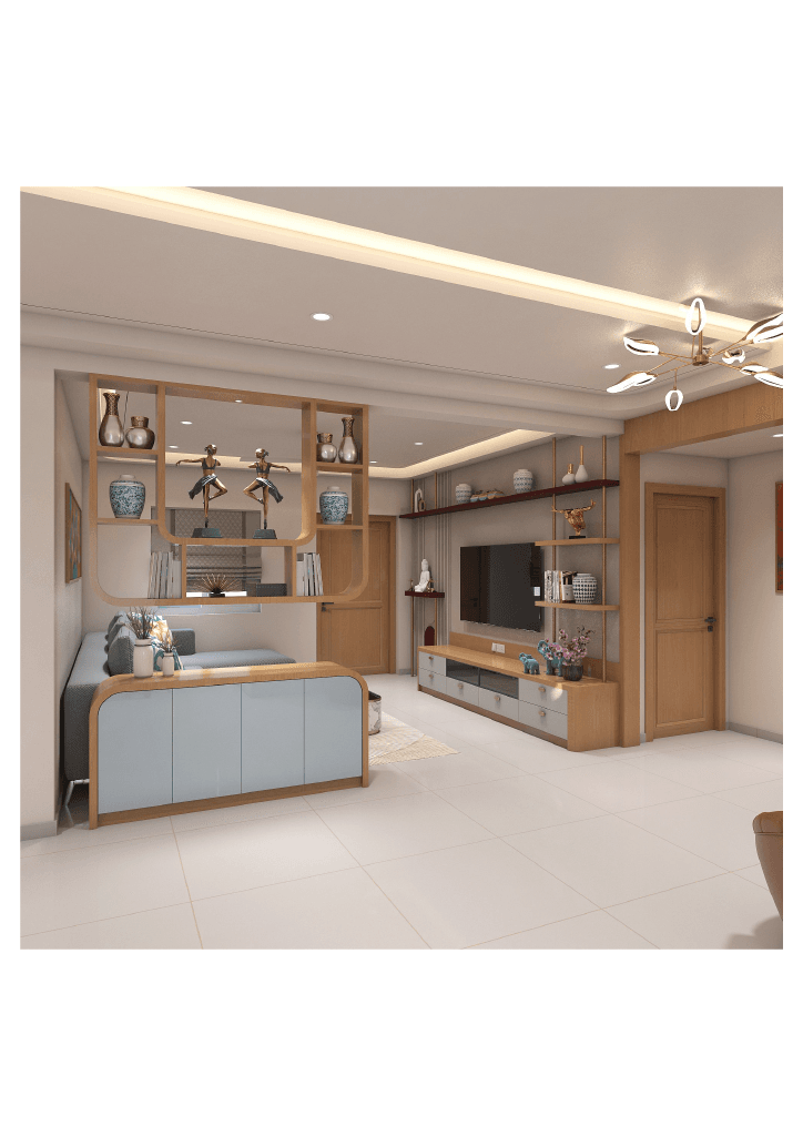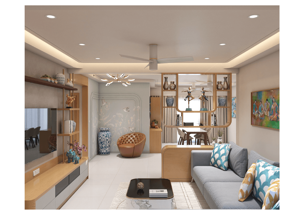 The living room carries a bright and breezy aesthetic with pastel accents, contemporary art, and a beautifully crafted open partition that visually divides the lounge and dining areas without feeling heavy. Every element — from the ceiling details to the décor shelves and muted flooring — is chosen to reflect harmony and openness.