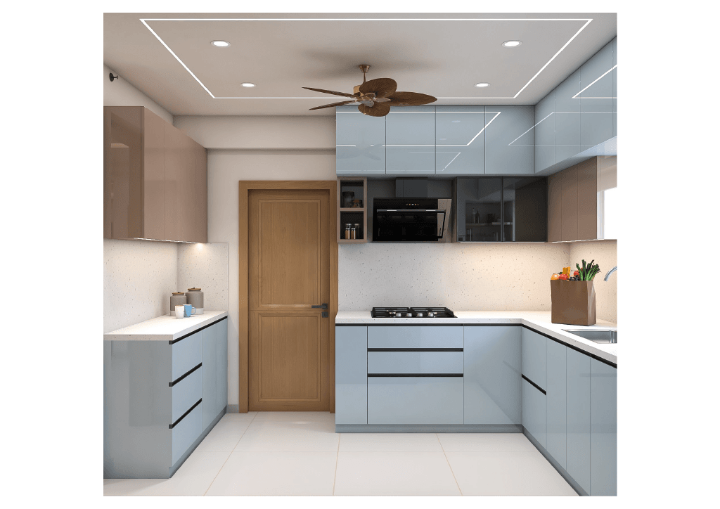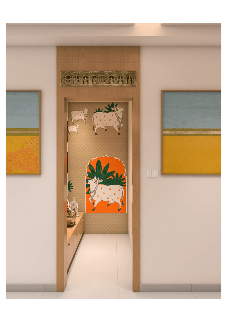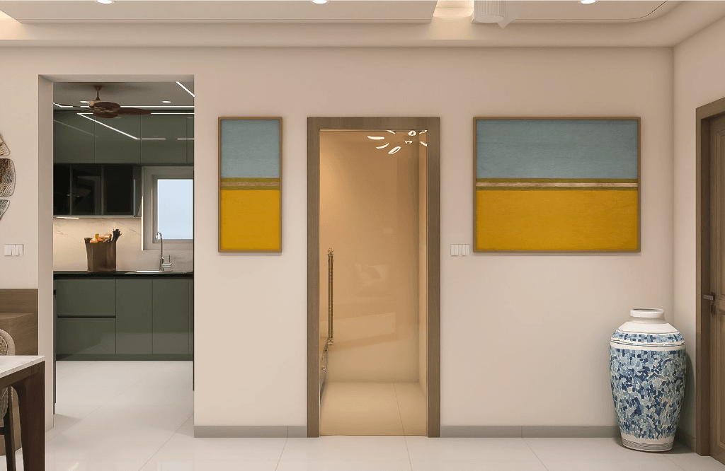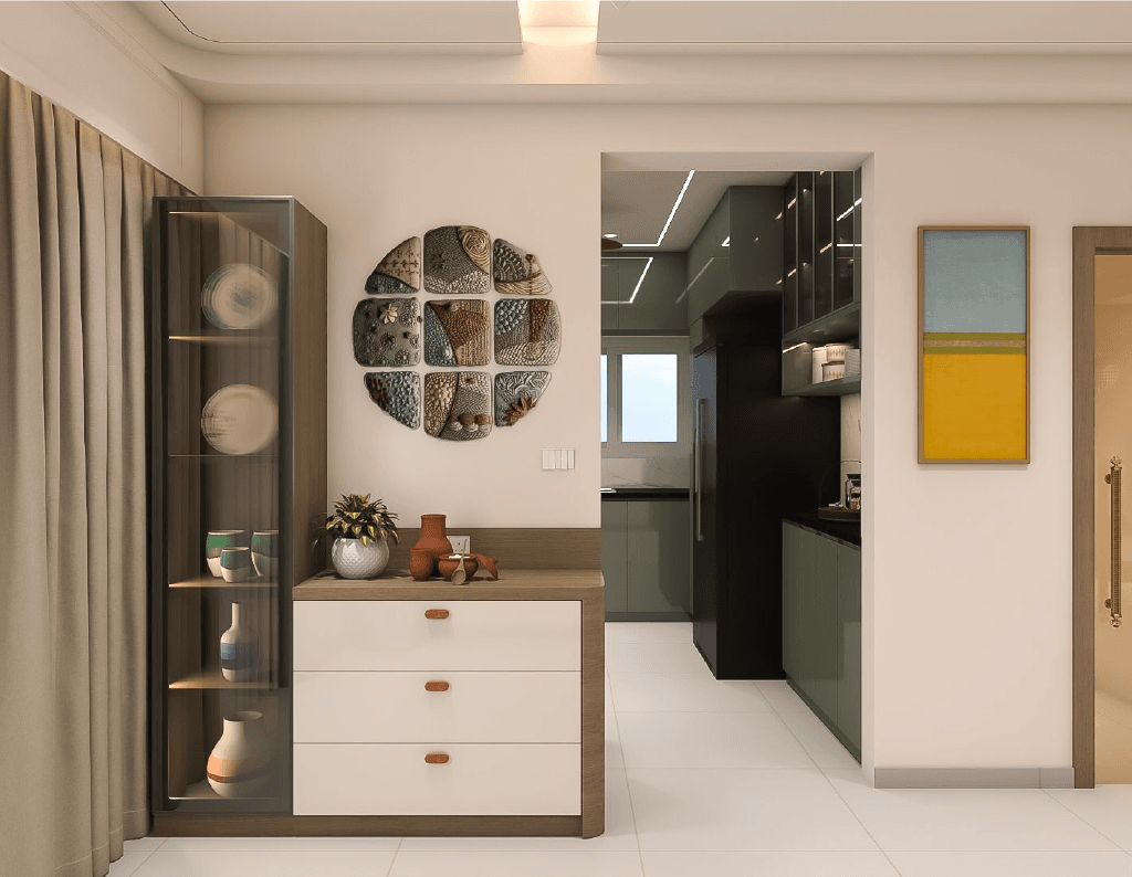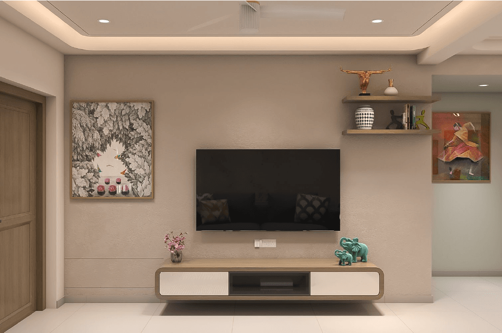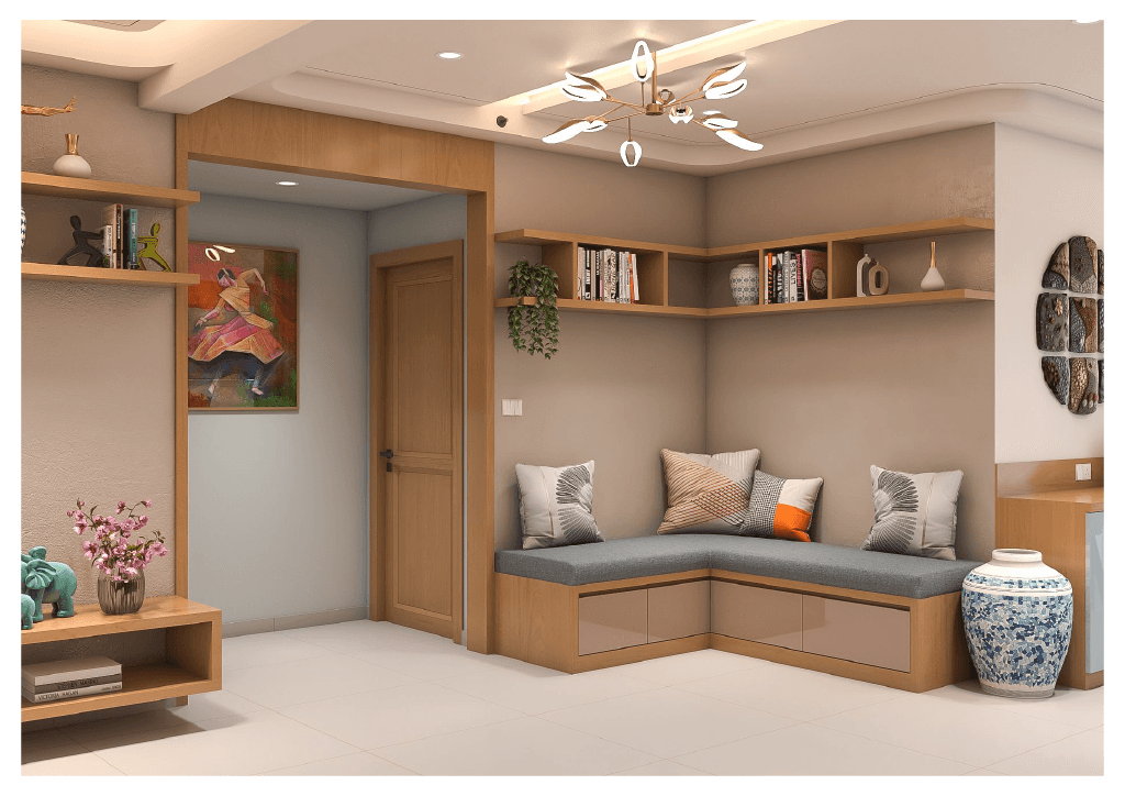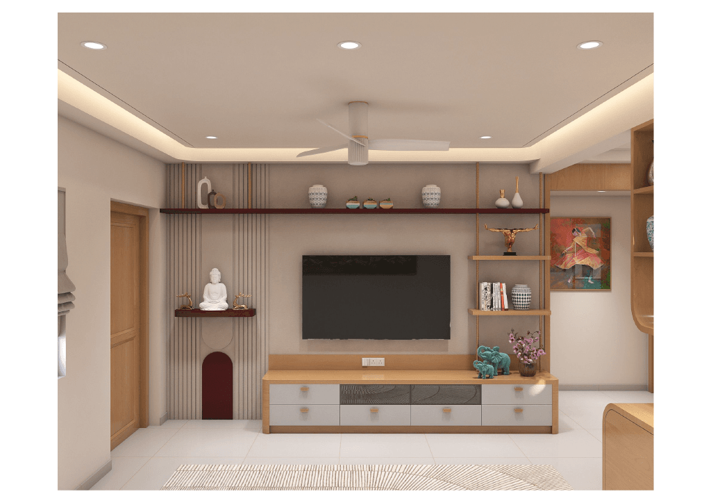 The living room carries a bright and breezy aesthetic with pastel accents, contemporary art, and a beautifully crafted open partition that visually divides the lounge and dining areas without feeling heavy. Every element — from the ceiling details to the décor shelves and muted flooring — is chosen to reflect harmony and openness.